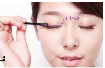 从眼角向眼尾细细涂抹眼影,紧贴着睫毛根部,涂抹宽度约2毫米即可。深色部分要窄一些,沿上睫毛边缘呈线状涂抹,颜色不要过浓重,否则反而会框住眼睛,显眼小。如果线条涂得不够平整也不要紧,后续重叠涂抹时就能调整自然。