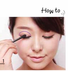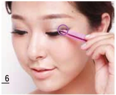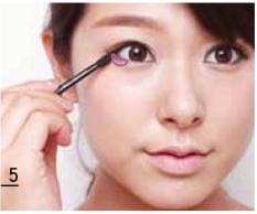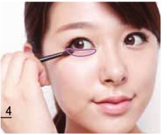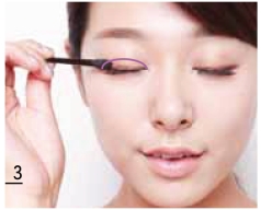 用深紫色的“影色”眼影,沿步骤2的眼线重叠涂抹,长度与眼线一样,宽度为双眼皮的宽度。