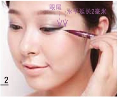 用黑色眼线膏或眼线液,沿上睫毛根部描画眼线。眼尾沿自身眼皮轮廓水平向外稍拉长约2毫米。