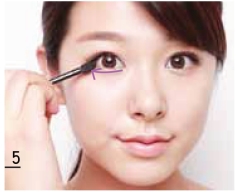 用海绵棒蘸取同色眼影,沿下睫毛根部从眼角向眼尾呈线状细细地涂抹眼影之后,描画眼线并涂抹睫毛膏,完成整体眼妆。