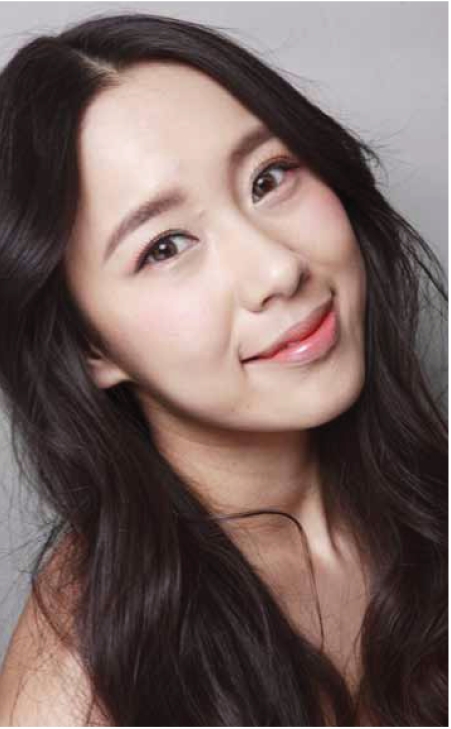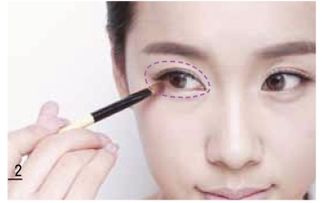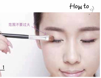从眼角向眼尾涂同色眼影,眼影的宽度约5毫米,眼角、眼尾与上眼睑的眼影衔接形成包围效果。用黑色睫毛膏刷上下睫毛,与白色光辉相得益彰。
