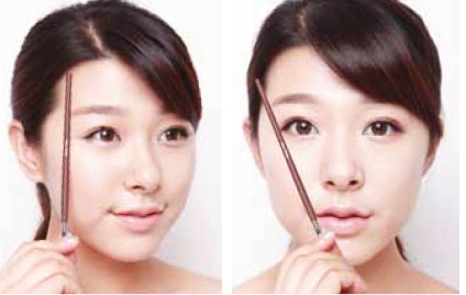 修整眉形前可以先确定关键点,不太熟练时可以用柄长10厘米左右的眼线笔、眉笔或螺旋眉刷来辅助,这样能简单地测出基本眉形。也可以边测出关键点边画上记号。