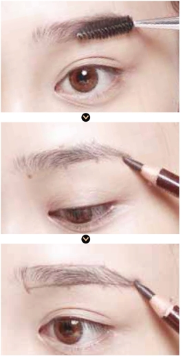 在根据左页确定适合脸型的眉形后,就要找到相适应的眉峰与眉下角度。需要注意的是,在标记前要先用眉毛专用的螺旋眉刷顺着毛发走向梳理眉毛。即使在不化妆的日子,也应坚持梳眉,久而久之,眉形会自然变得整洁。