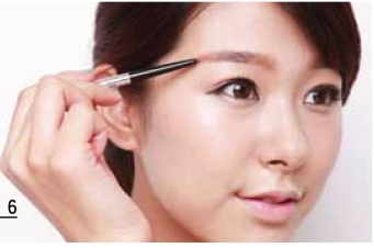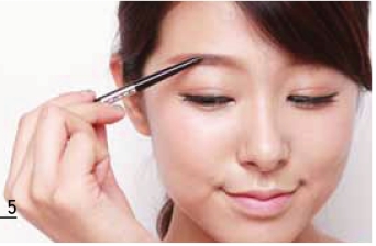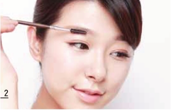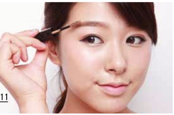 眉毛中部毛发欠缺处,用眉笔沿毛发生长方向,边变换描画角度,边一根一根地仔细画出毛束感,将眉毛之间的空隙自然填补,不露出泛白的肌肤,不要用眉笔涂满颜色。