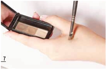 用眉刷蘸取眉粉后,不要直接晕染在眉毛上,先在手背上调试一下颜色的浓淡,去除刷头的余粉,这样可以避免涂抹后颜色过重。