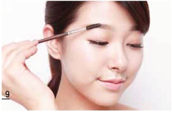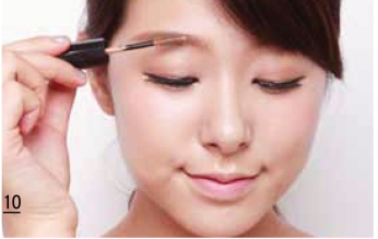 使用眉笔与眉粉后,用接近发色的染眉膏来调整眉色,可以使眉部印象更饱满,呈现绒毛质感。用染眉膏先从眉尾开始,逆着毛发生长方向移动刷头,这样可以使眉毛内侧充分着色。