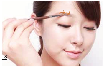 用眉刷蘸取眉粉,从眉毛中部开始,向眉头,逆着毛发生长方向,填入眉毛间隙。眉头部分用眉刷上剩余的眉粉薄薄扫过即可。