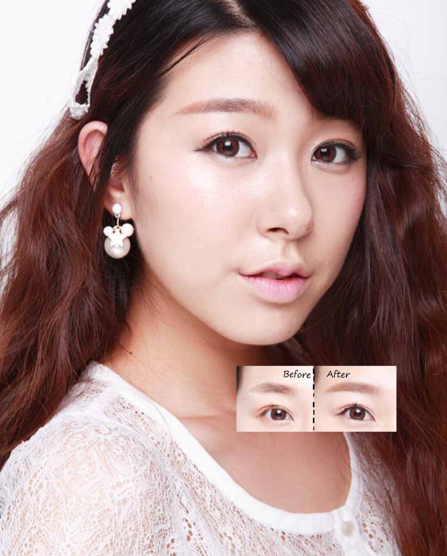 描画颜色过于浅淡的眉毛时,通常为了强化眉色,会用眉笔过度描绘出“同一浓度”的粗重眉,这样反而会显得双眉过于浓重,十分不自然。正确做法是,用眉笔勾勒眉形下部边缘略外侧的线条,加强眉形下部轮廓的清晰度。之后用深、浅眉粉在不同部位着色,自然调整眉色浓淡,提升眉尾的存在感,使双眉立体饱满而不浓重。