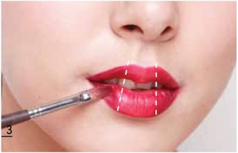 用唇刷取深红色唇膏,由嘴角向内涂,上下唇中部不涂,由嘴角至唇中用深浅唇膏涂抹呈过渡色。