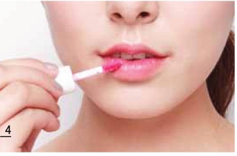 用粉红色唇彩涂抹下唇中部,涂抹面积可以宽一些,提升唇部的立体光泽。