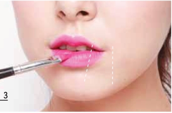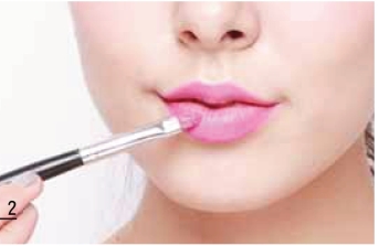 用唇刷涂深粉色唇膏,只涂抹靠近内侧的1/2部分,上下唇外侧均不涂。