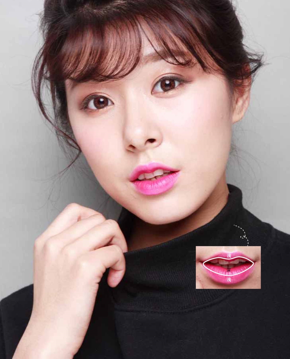 1 用深浅两种粉色唇膏,浅色打底,深色涂抹内侧1/2处,内外的颜色由深至浅,像水粉一般晕开,鲜艳的粉色也不会感觉过于跳跃。