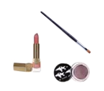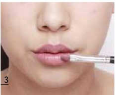 用唇刷将带有灰色的烟粉色唇膏涂在整个唇部。下唇纵向顺唇纹涂抹,使颜色填满纹理中。