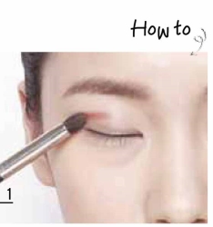将棕色眼影沿着双眼皮线在上眼皮后半部分画出5毫米宽的线条,然后用眼影刷轻轻晕染开。