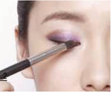 将带有淡淡珠光的紫色眼影涂在上眼皮前半部分,从眼角开始向中间晕染,宽度不超过双眼皮。