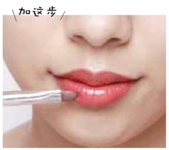 在双唇涂抹滋润度较高的护唇膏,然后用唇刷涂抹唇膏,护唇膏与唇膏混合涂抹后,双唇会倍显润泽。