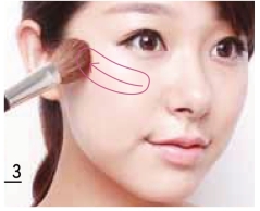 只在正面涂圆形腮红,侧面的效果就会减半。但是如果直接横向加宽或涂大圆,就会显得脸颊宽。这时可以借助“三向”涂法,既顾及到侧面,又不会使颜色集中到脸部轮廓附近,同时收敛了轮廓,一举三得。