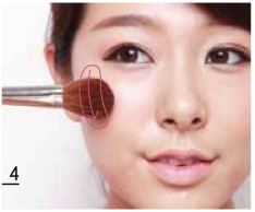 由耳部前侧→脸颊中央折回刷头,3个方向好似画三角形般。三角形中部稍转动刷头将颜色晕匀。