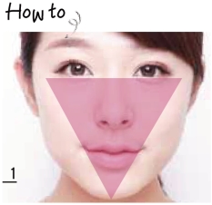 从两眼角连线开始,以轻轻掠过的手法刷到鼻尖部位。用刷头上的余粉边画圈边涂下巴中部,宽度不要超过嘴角。注意长脸型或下巴较突出的人不适合下巴提亮。