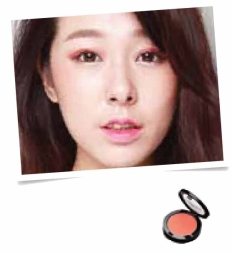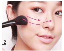 从眼部下方平行横向晕染,并向鼻尖一带而过,给人健康的印象。但要注意,横向腮红容易将脸颊往左右拉伸,因此比较适合长脸型的人。