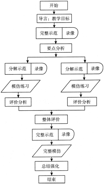 教学过程的表述是采用类似于计算机流程图的形式,把复杂的教学过程分解为相对简单的几个环节,将教学过程中各个要素之间的关系很好地显示出来。这既能够对教学过程进行优化,同时还能够保证教学过程得以有序开展。大多数体育教学内容的操作过程都可以使用流程图来进行表示。