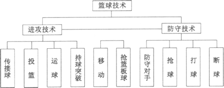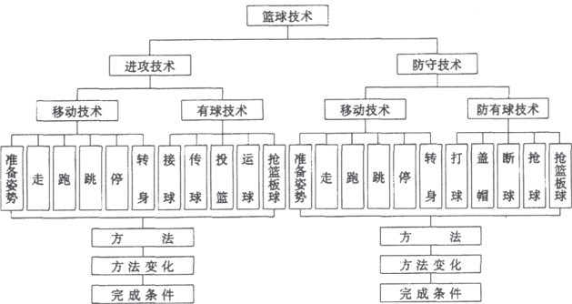 以动作结构作为分类的主要依据,换句话说,就是按照动作的运动学结构和动力学结构的类似特点来划分篮球技术动作。自篮球运动被发明之后,这种分类方法就一直被沿用,并且也经过了不断地发展和完善,逐渐形成了如图5-1所示的篮球技术系统化的分类网络。后来,通过不断的研究和实践的证明,这种方法又得到了进一步的完善和发展,形成了如图5-2所示这一分类体系。尽管这一分类体系还有一些地方需要做进一步的改进和完善,但在我国已经被认可和应用,并且取得了较为理想的运用效果。