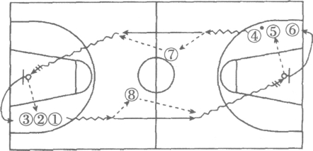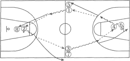 (2)运球、传接球、投篮的训练方法。在全场中,将队员分为两组。①和④各持一球,同时开始运球,运至罚球线延长线时,分别将球传给⑧和⑦,传球后迅速向篮下切进,途中再接⑧和⑦的回传球,快速运球上篮。投篮后自抢篮板球,分别传给⑤和②。按照上述顺序进行重复训练,如图5-11所示。