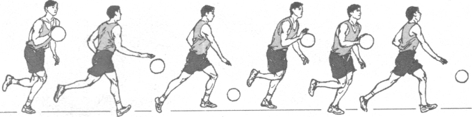 在快速运球中突然急停时,采用两步急停,使身体重心降低,手按拍球的前上部,使球停止向前运行。运球急起时,两脚用力后蹬,上体急剧前倾,迅速起动,同时,按拍球的后上部,人、球同步快速前进。