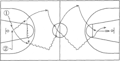 (2)全场二防一。一人运球,两人防守,进行全场攻守训练。要求反复进行训练。