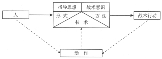 技术是战术的物质载体和实际内容,是战术的基础;阵势是战术的外在表现,一定的形式反映一定的内容;方法是队员间协同完成战术行动的具体手段、要求和程序,是战术的核心。上述要素之间的结构关系,可以用图6-1来表示。