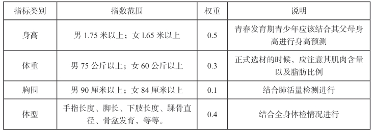 所谓体态类指标,也就是对运动员或者学习者外形的考核指标。这一点不仅在考核的时候十分重要,而且在对于篮球选材也有很重要的影响。具体而言,体态类指标的内容以及相应权重如下表7-1所示。