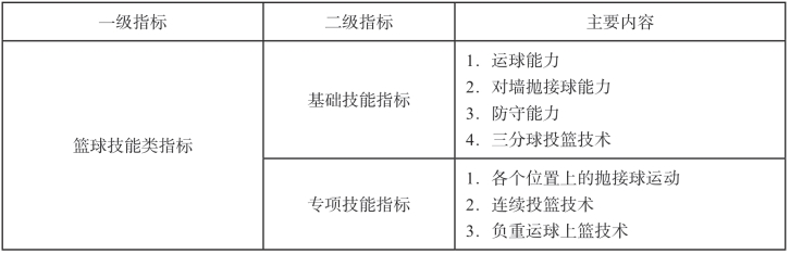 和其他种类的体能运动一样,高校篮球教育也要有一定的考核以及评价体系,而评价体系的构建,离不开相应的考评指标。具体而言,高校篮球体能教学一般由一级指标以及二级指标双重指标构成。而一级指标,主要包括体态、机能、运动素质乃至技能类指标之类。