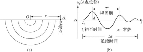 如图3—2所示,假设在离震源距离为r1的A点观测质点振动位移随时间的变化规律,用时间 t 为横坐标,质点位移u为纵坐标作图,可得到图3—2(b)所示的图形,从图中可看出该点地震波振动的位移大小(称之为振幅值变化)、振动周期(T)、延续时间(Δt)等特征。这种用(u,t)坐标系统表示的质点振动位移随时间变化的图形称为地震波的振动图。在实际地震记录中,每一道记录就是一个观测点的地震波振动图。