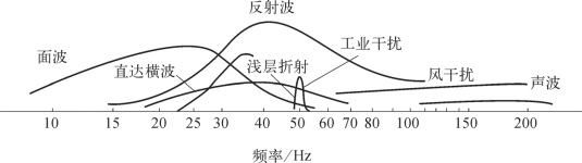 图3—6是野外获得的各种不同类型地震波的能量主要分布频带范围。由图可知:反射、折射波的能量(振幅A)主要分布在40~80 Hz频域内;面波的能量分布在10~30 Hz频域内;交流电干扰的能量分布在50 Hz左右的狭窄频域内;微震干扰的能量分布的频域较宽,其中声波的能量分布在100 Hz以上的较高频域部分。这样,我们就可以利用有效波(反射波、折射波)与干扰波(微震、声波、面波等)频率谱特性的差异,使地震仪各个部分都具有相应的频率滤波特性,主要接收频率在40~80 Hz范围内的反射波、折射波,而把主要能量分布在此频域以外的干扰波滤掉。从而在地震记录上突出了有效波(信号)能量,压制了许多干扰波(噪声)能量,这就提高了地震记录的信噪比,从而有利于清晰识别有效波和提高地震勘探资料解释的质量。