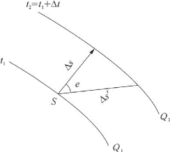 根据场论可知,任何一种场的分布,都可以用等值面和力线来表示,时间场也不例外,等时面就是等值面,而波射线则相当于力线,波射线的方向就是时间的梯度方向。如图3—8所示,假设地震波在某时刻t1位于Q1位置,经过Δt时间后于t2时刻(t2=t1+Δt)到达Q2位置,之间垂直距离为Δs,波传播速度为,按梯度定义可表示为: