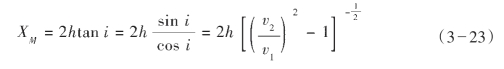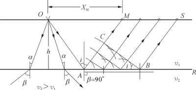 折射波的射线是垂直于波前BC的一簇平行直线,并与界面法线的夹角为临界角。射线AM是折射波的第一条射线,在地面上从M点开始才能观测到折射波,所以称M点为折射波的始点,自震源到M点的范围内,在地面观测不到折射波(或说不存在折射波),称这个范围为折射波的盲区,表示为XM,其数值为: