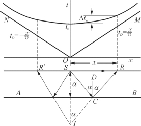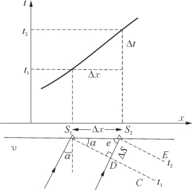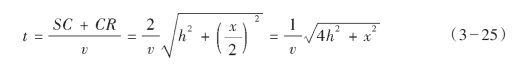 设 是平均速度,反射波的到达时间t是(SC+CR)/。由于SC=CI,所以IR与波传播路径SCR的长度相等,因此,t=IR/,如果变量x是炮检距,则