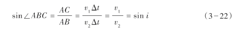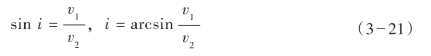 折射波的波前是界面上各点源向上覆介质中发出的半圆形子波的包线,从图3—15可见,滑行波自A点以速度2滑行了一段时间Δt,波前到达B点,则AB=2Δt,同时A点向上覆介质发出半圆形子波,其半径为AC=1Δt,从B点作A点发出子波波前圆弧的切线BC,就为该时刻的折射波的波前,可证明它与界面的夹角∠ABC为临界角i,由△ABC为直角三角形,可得: