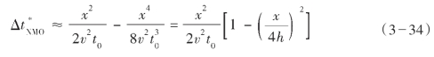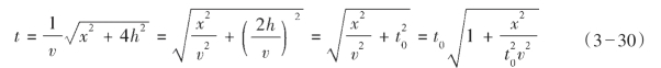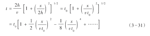 可以从式(3—30)中由地震记录求出旅行时间t。通常2h>x,则可以用下面形式的二项式展开: