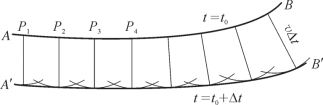对于理解波的传播过程,惠更斯原理非常重要,并常用于绘制连续的波前。惠更斯原理的定义是,在波前面上的任意一个点,都可以看成是一个新的震源,其中隐含的物理意义是,在同一波前面上的每一个质点,都从它们的平衡状态开始,基本上以同一方式振动。因此,在其相邻质点上,弹性力会由该波前的振动产生变化,因而会迫使下一个波前的质点运动。这样,惠更斯原理就能解释扰动怎样在介质中传播。更具体一点说,对于给定的某时刻波前的位置,把该波前的每一个质点都作为新的震源,可以确定将来某一时刻波前的位置。在图3—10中,AB是在t0时刻的波前。在时间间隔Δt内,波传播的距离为Δt,其中 是地震波的传播速度(它可以随空间变化),在t0时刻的波前上选一系列点P1,P2,P3,……,以这些点为圆心,以Δt为半径画弧,只要选择了足够的点数,这些弧的包络就形成了新的波前,随着点数的增加,所绘制的波前也会达到任意精度,在该包络之外,波会产生相消干涉,使它们的效应相互抵消,当AB是一个平面,速度是一个常数时,只需要选两个点数,画两个圆弧,作一条和两个圆弧相切的直线,就会得到新的波前位置。需要注意的是,惠更斯原理只给出相位信息,不能给出振幅的大小。