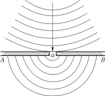 为了进一步了解波前的运动过程,举例说明下列常见的现象。如图3—9所示,AB是一道长堤,中间有一桥涵洞a,当一系列水面波自堤外向堤内传播时,被堤阻挡不能通过,但堤内仍然可以激起水面波,可以看到这些水面波好像是以桥涵洞a为波源发出的半圆形波,称为元波前,它与原来波前的形状无关,这一现象称为波的绕射。所谓“波前原理”(也叫惠更斯原理),即介质中传播的波,其波前面上的每一个点,都可以看作是波向各个方向传播的波源(点震源)。