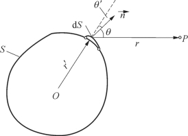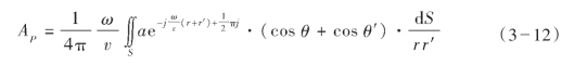 式中,a为震源O处初振幅,为介质中波速,ω为波动圆频率,r、r′、θ及θ′为如图3—11所示的距离及角度;n→ 为面积单元dS的法向量。