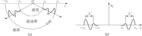 振动图只反映了地面某一质点的振动情况,而波剖面图则反映了波在传播过程中,在某一时刻整个介质振动分布的情况。如图3—3(a)所示,假设在某一确定的时刻 t,在距离震源点O的一定范围内的各不同距离的点上,同时观测它们质点振动的情况,并以观测点与震源O的距离x为横坐标,以质点离开平衡位置的位移u为纵坐标作图,所得图形如图3—3(b)所示,从图中可以看出质点振动的波长λ和该时刻的起振点x2(波前)及停振点x1(波尾)等特征。这种描述某一时刻t质点振动位移u随距离x变化的图形称之为波剖面图。