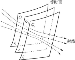和重力场、磁力场等概念相似,时间场是指这样一个空间,在这空间任意位置处都有地震波在t时间通过。在时间场中,波前到达时间相等的点所构成的面称为等时面。显然,波前面就是等时面。如果依次给出不同的时间值t1,t2,t3,……,根据给定的波速值,可确定出等时面簇Q1,Q2,Q3,……的空间位置(如图3—7所示)。