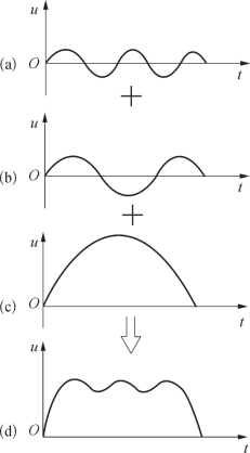 如图3—4所示,三个频率、相位与振幅都不同的谐和振动(a)、(b)、(c)相加就可组合为一个复杂的振动(d)。