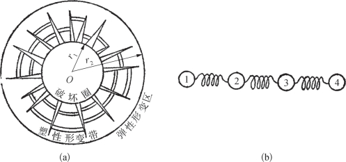 在塑性带以外,随着传播距离 r 的继续增大,冲击波的能量密度继续明显衰减,使岩石所受压力降低到弹性限度之内,形变和应力很小,作用时间又很短促,岩石就具有完全弹性体的性质,其质点受激而产生弹性位移(形变),同时也就发生与之对抗的应力,使质点产生反向位移,从而使质点在平衡位置附近形成弹性振动。在塑性带外面的区域就是所谓的弹性形变区。在本区内,由于岩石具有连续结构,各质点之间存在弹性联系,使弹性介质的作用好像是一种用弹簧连接起来的质点组成的阵列,如图3—1(b)所示,每个质点在各自平衡位置上作弹性振动,而且离震源[即图3—1(a)及图3—2(a)中的O点]不同距离的质点依次先后产生这种振动。