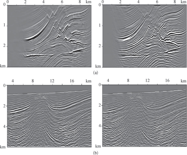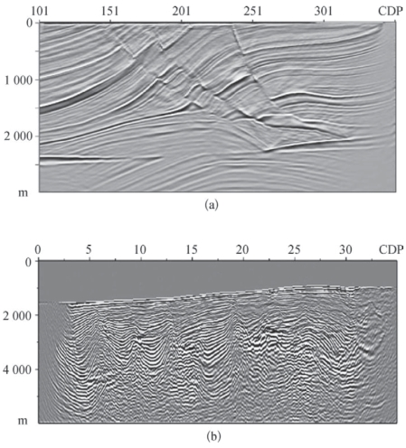 频域逆时偏移在近几年得到了迅速发展。Kim等提出一种带震源估计的频域逆时偏移,并且用实例证明了由估计的震源子波可得到更好的逆时偏移效果。Chung等利用波场分离实现了弹性波频域逆时偏移,首先利用Helmholtz分解获得解耦的虚拟震源波场和反传波场,然后进行零延迟反褶积,得到了更为精确的成像效果。Lee等提出了利用波场L1模的频域逆时偏移,随后进一步开发了利用波场对数和L1模的频域逆时偏移,消除了在互相关成像条件下波场存在噪声时出现的扭曲成像现象。Liu等利用上、下行波场分离实现了井中频域逆时偏移,能够减少不进行波场分离的常规逆时偏移中产生的成像假象。图3—34为频域逆时偏移实例。