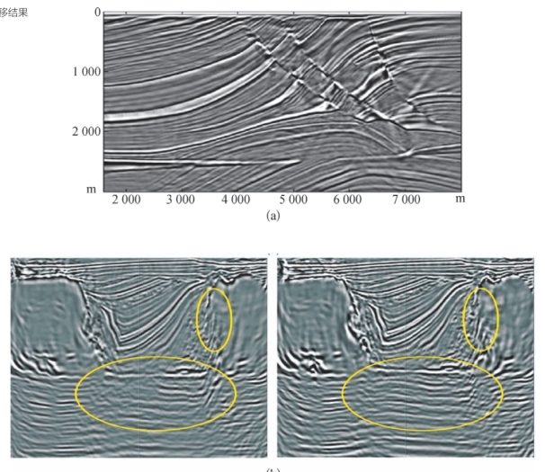 (a)改进Marmousi模型保幅逆时偏移结果;(b)探区宽方位角数据各向同性(左)和TTI(右)建模场逆时偏移结果