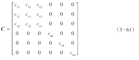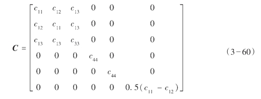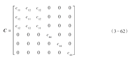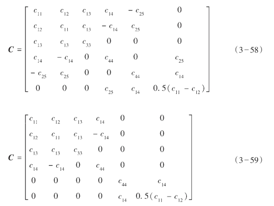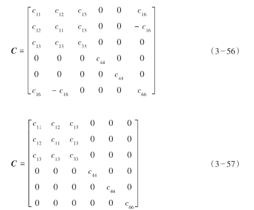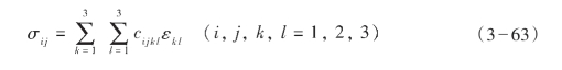 式中,σij为应力张量;cijkl为弹性劲度常数,简称弹性系数,也称刚度张量或刚度矩阵;εkl为应变张量。因为式(3—63)中包含9个方程(下标ij所有可能的组合),每个方程中有9个应变变量,故有81个弹性系数。当应力满足对称(σij=σji)时,可以增加条件: