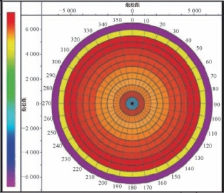 图3—42 方位上偏移距对采集的相对贡献(从紫到红代表道数增多)